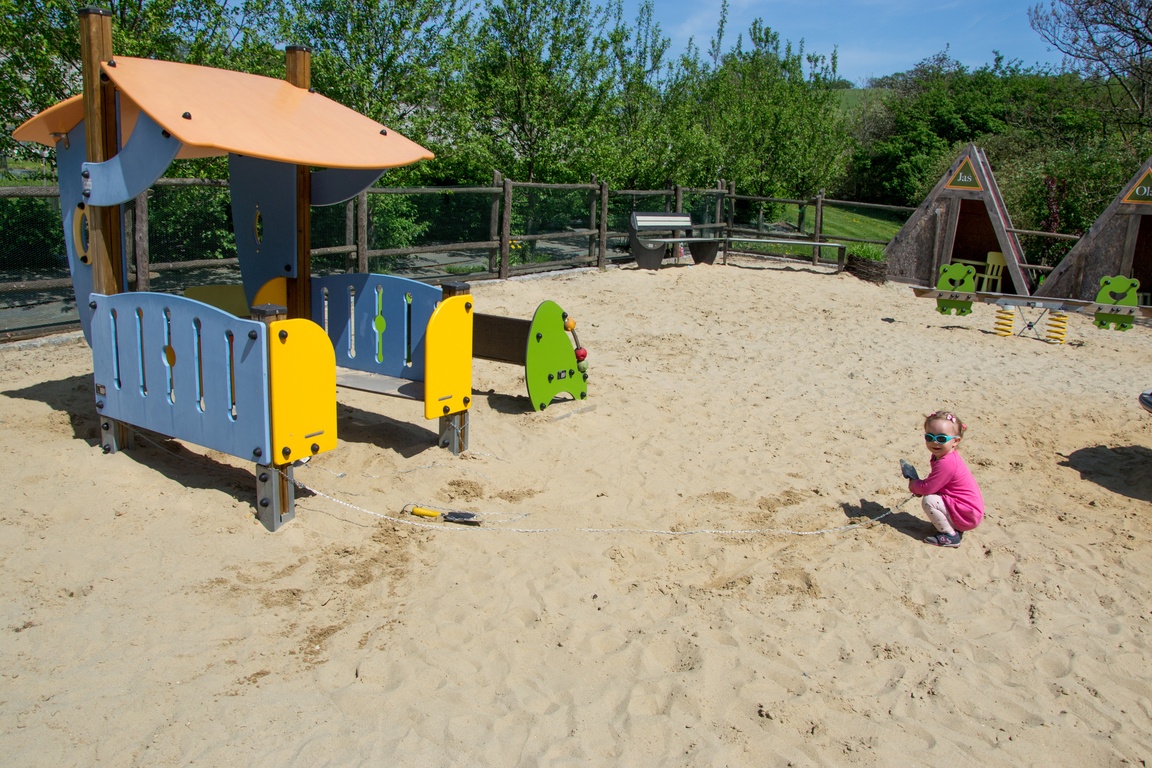 Jeśli Wasze dzieci lubią bawić się w piasku warto mieć ze sobą swój sprzęt. Na miejscu były trzy łopatki na łańcuszkach (czyżby ktoś próbował je zabrać ze sobą do domu?), czy wigwamy „Jaś” i „Ola”, w których można schronić się przed słońcem i porysować.