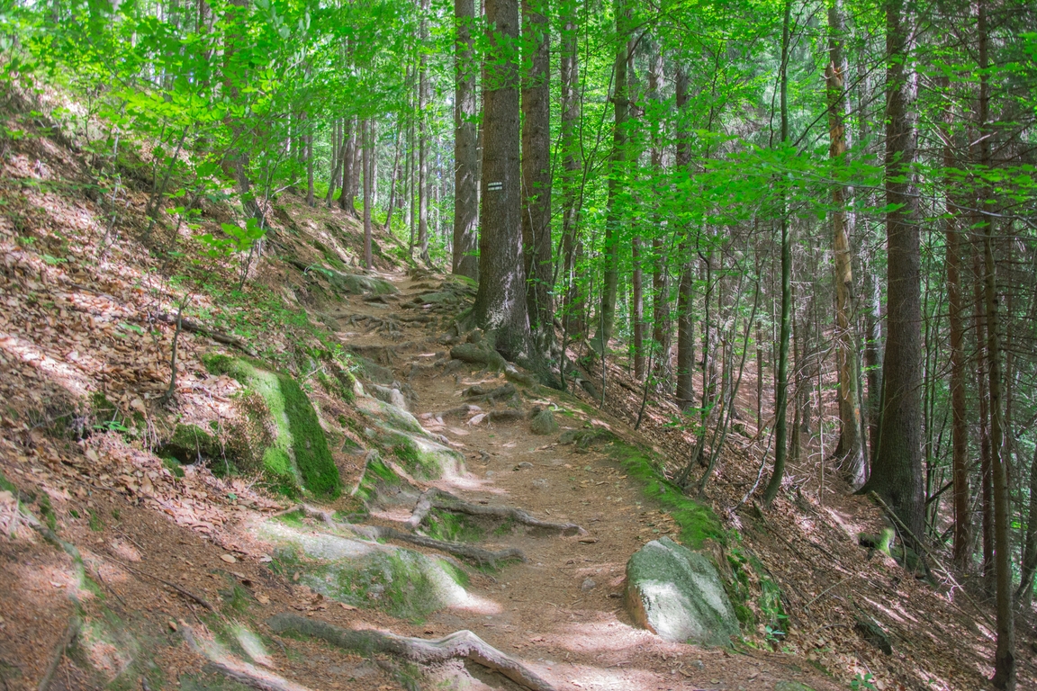 Pierwszy odcinek drogi, mimo że stromy, jest bardzo przyjemny. Najpierw ostre podejście, później w miarę prosta i szeroka droga do rozstaja dróg i skrzyżowania szlaków, my idziemy czarnym w lewo, ten w prawo prowadzi do Szklarskiej Poręby Dolnej.