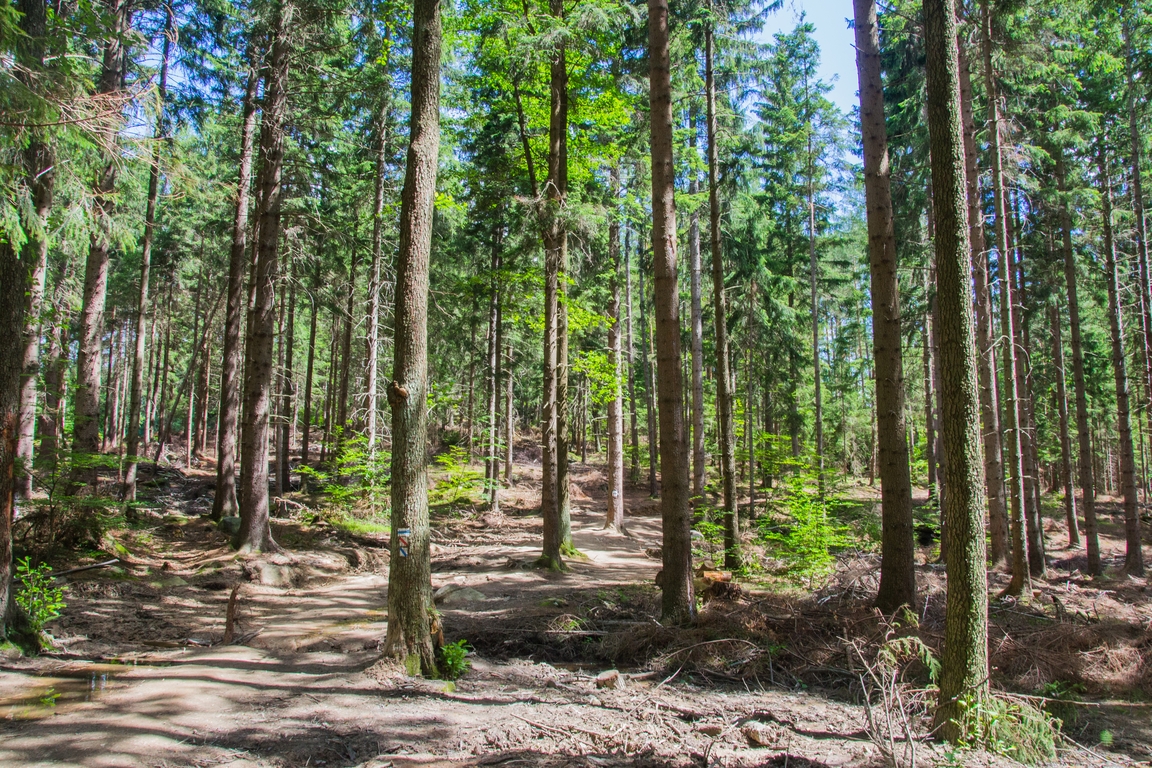 Auto zostawiłem na parkingu przy drodze nr 3 z Piechowic do Szklarskiej Poręby. Tuż przy pasach jest wejście na czarny szlak. Droga początkowo wiedzie ostro w górę. Idziemy po konarach drzew i kamieniach. Nad nami wysokie, pięknie pachnące sosny, które sprawiają, że czujemy się nie jak w karkonoskim lesie (stop, ta strona Szklarskiej leży w Górach Izerskich), ale nad morzem.