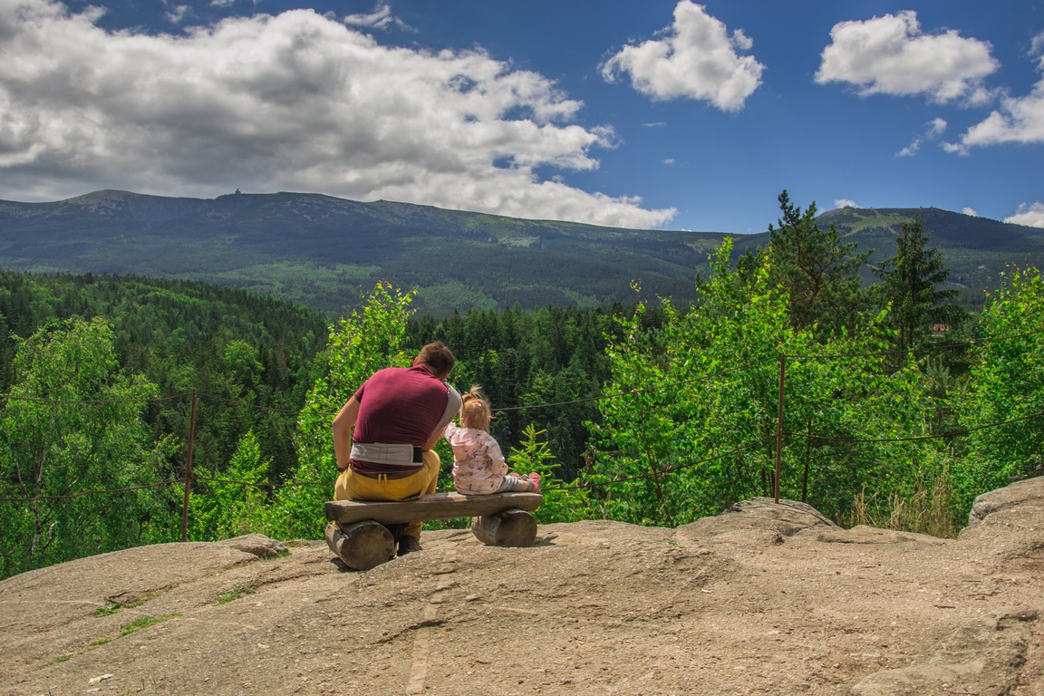 Na miejscu jest kilka ławeczek, z których można rozkoszować się widokiem. Na skraju są barierki, ale uważajcie na dzieci, próg skalny jest bardzo stromy! Nasza Sara na szczęście była bardziej zainteresowana zabawą na ławkach i wielkim głazie z hologramem (punkt Magicznego Szlaku Ducha Gór) i nie w głowie było jej podchodzenie do barierek, ale w takich miejscach trzeba mieć oczy dookoła głowy!
