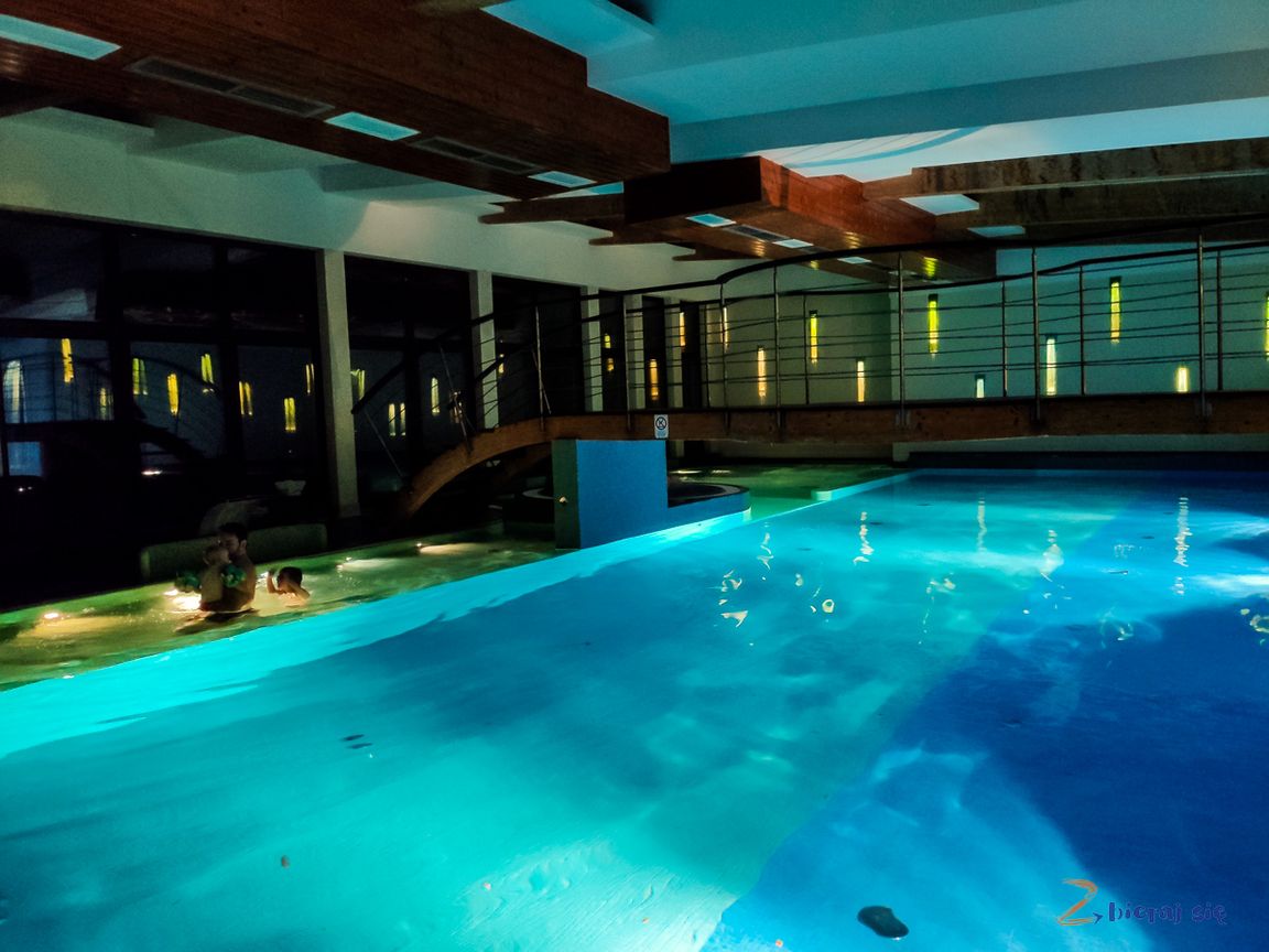 Prócz tego, na gości hotelowych czeka bardzo atrakcyjna Strefa Wellnes. Mieści się w niej duży basen z dwoma brodzikami, jacuzzi, strefa saun, grota solna i siłownia. Jako mama dwójki maluchów doceniam, że jedna niecka ma odpowiednią głębokość dla dzieci, a przejście na basen możliwe jest podziemiem z głównego budynku.