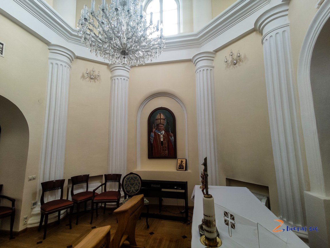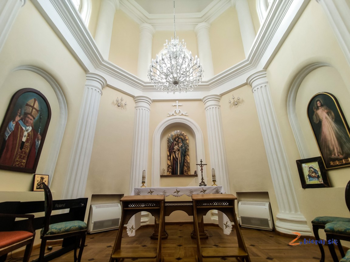 Do dziś na ścianach znajdują się klasycystyczne polichromie, a w obrębie głównego budynku dworu mieści się kaplica z wysoką, niemal 10 metrową wieżą.