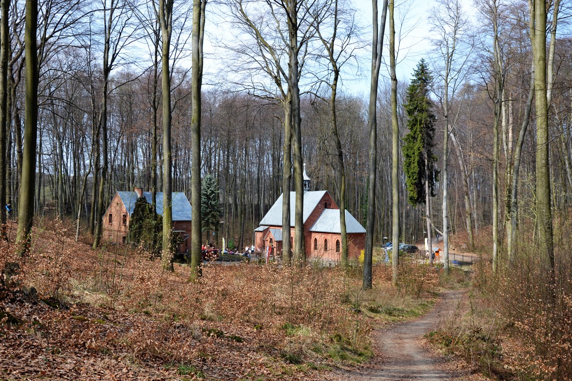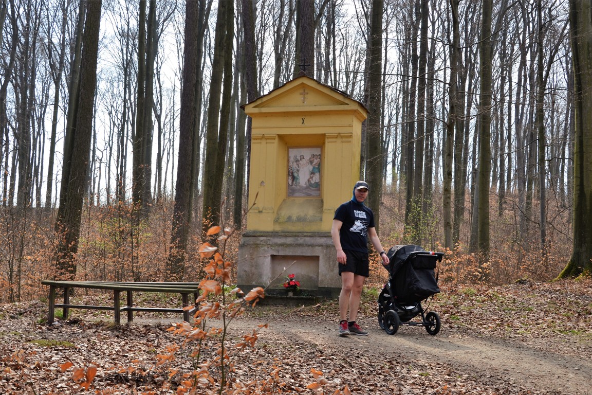 Wizyta w tym miejscu to jednak nie tylko natura. W Lesie Bukowym mieści się bowiem Kościółek Leśny (Kościół Czternastu Świętych Wspomożycieli) i Grota Matki Boskiej z Lourdes oraz żółte kapliczki drogi krzyżowej. W niedzielę w kościółku odbywają się msze święte, które cieszą się dużym zainteresowaniem. Trasa od stawów do kościółka (początek naszego biegu) była mocno zatłoczona i obawialiśmy się, ze jednak w całym lesie będą takie tłumy jak w Tatrach :P. Kiedy jednak minęliśmy kościółek okazało się, że zostaliśmy sami. Później na trasie spotkaliśmy kilku biegaczy, rowerzystów i rodziców z dziećmi.
