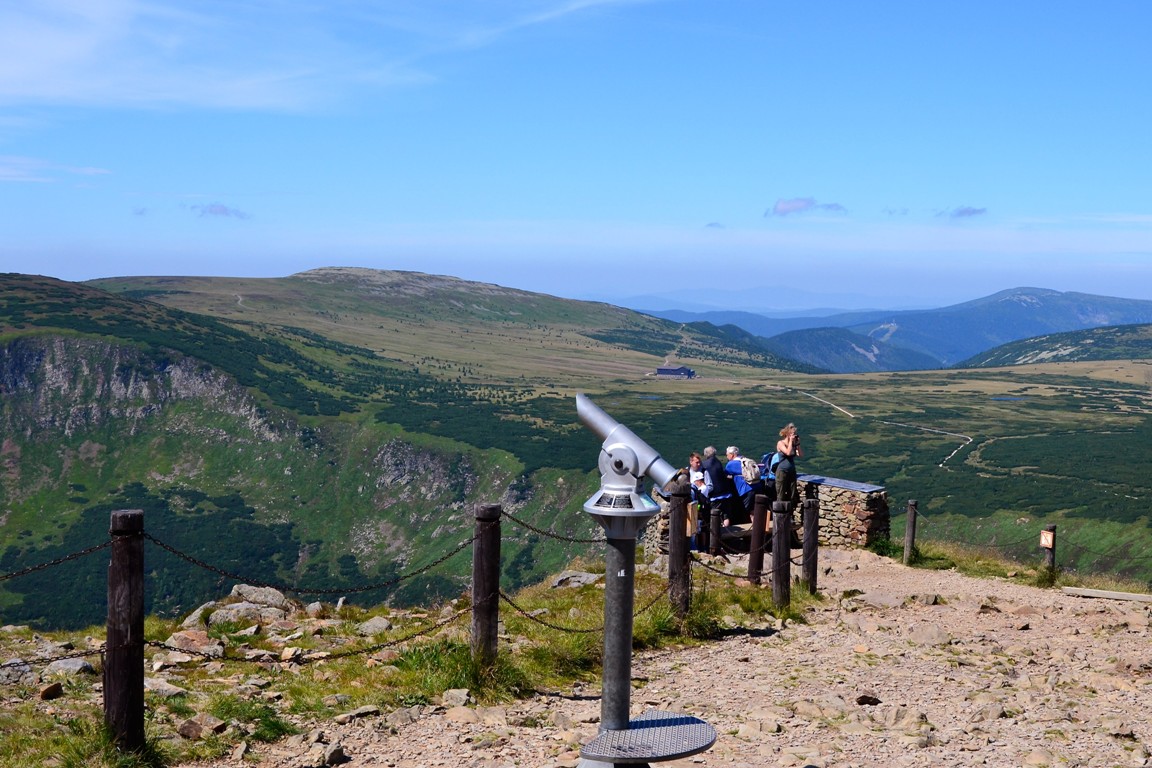 Do schroniska dotarliśmy około 14. Zdecydowaliśmy się na trasę spod Kościoła Wang w Karpaczu, szlakiem nad Kotłem Wielkiego Stawu (7,5km, 610 m przewyższenia). Do wyboru mieliśmy też trasę przez Samotnię i Strzechę Akademicką (7,5 km, 595 m przewyższenia). Wcześniej zastanawialiśmy się, czy lepiej nie iść z Peca pod Snezkou przez Vyrovkę (7,7 km, 748 m przewyższenia). Długość trasy była porównywalna, dlatego tym razem zdecydowaliśmy się na spacer po polskiej stronie.
