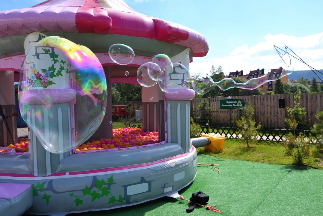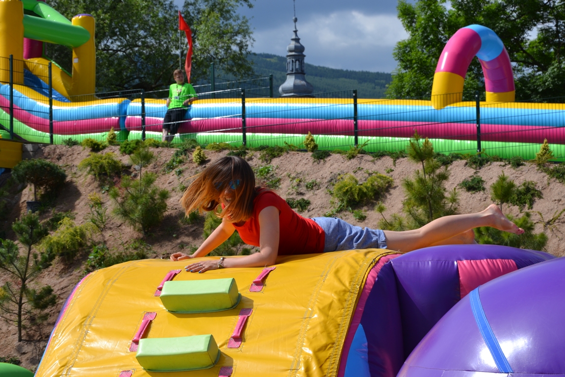 Dmuchane zamki, torty, olbrzymie bańki mydlane, 7-metrowa skocznia, gigantyczna zjeżdżalnia pontonów, basen z łódkami, krokodyl pożerający małe dzieci (te duże też, ale te małe bardziej się boją) i … gąsienica, do której wchodzisz paszczą, a wychodzisz… pod ogonem :P, albo odwrotnie. Do tego plaża z leżakami, sztuczna trawa, drobny, czyściutki i idealny do lepienia babek piasek, a to wszystko zaledwie 15 minut od Karpacza, a 30 minut od Jeleniej Góry.
