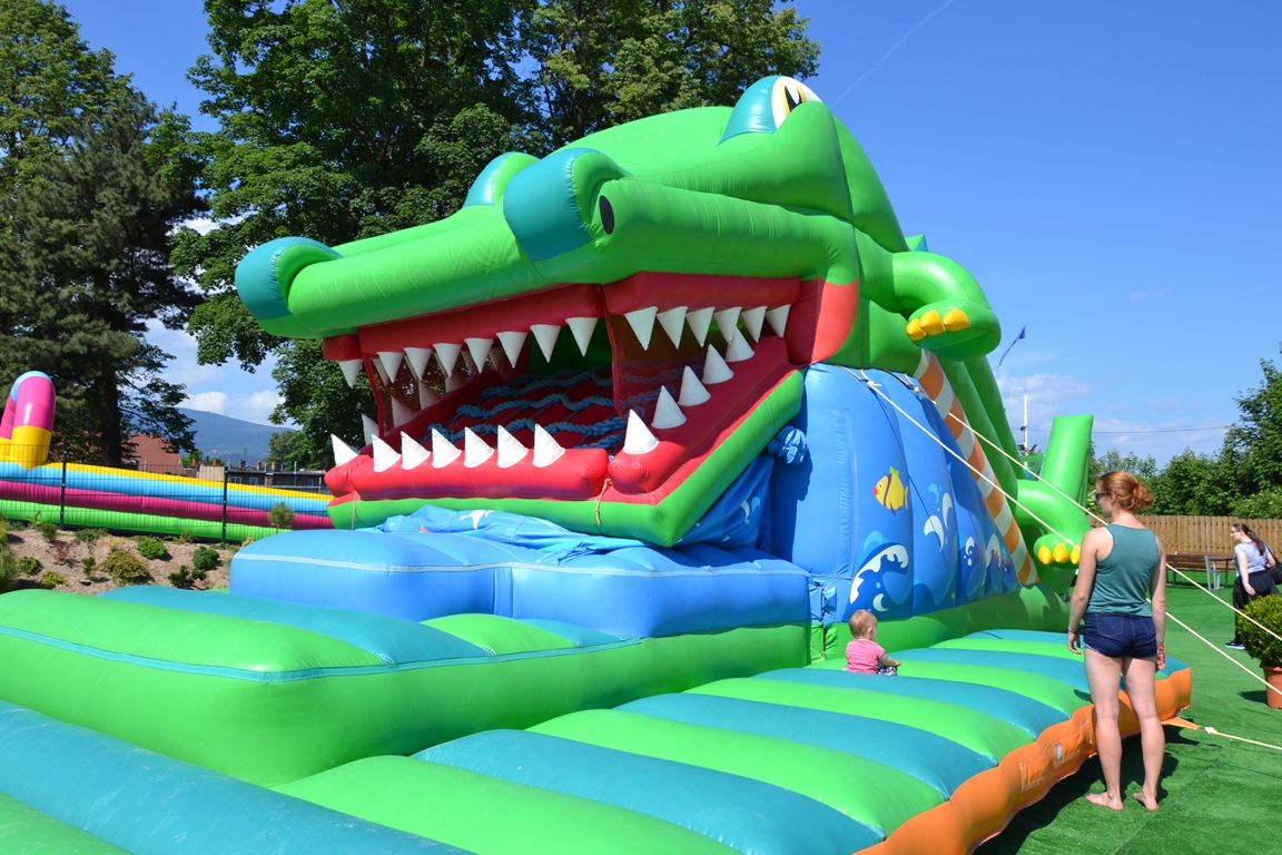 A kiedy znudzą Cię już opowieści o księżniczkach w zamku, albo tych wyskakujących z tortu i skaczących rycerzach możesz zmierzyć się z ruchomym krokodylem – uwaga! Gryzie! Nasza S. myślała, że naprawdę chce ją zjeść i zaczęła płakać kiedy zamykał swoją paszczę! Na szczęście mama i ciocia obroniły ją zarówno przed żarłocznymi zębami tego dmuchanego stwora, ale i przed łzami!