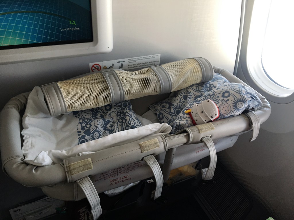 Dużo więcej miejsca mieliśmy w samolocie z Warszawy do Los Angeles. Przed wylotem poinformowaliśmy LOT, że lecimy z dzieckiem i chcielibyśmy mieć dla niego kołyskę. A taka kołyska jest montowana w pierwszym rzędzie klasy ekonomicznej. Miejsca są o tyle fajne, że przestrzeń na nogi jest dość duża, można je swobodnie rozprostować, a dziecko jak się uprze może sobie trochę pochodzić koło nas. Ba! Może sobie urządzić tam prawdziwą zagrodę.