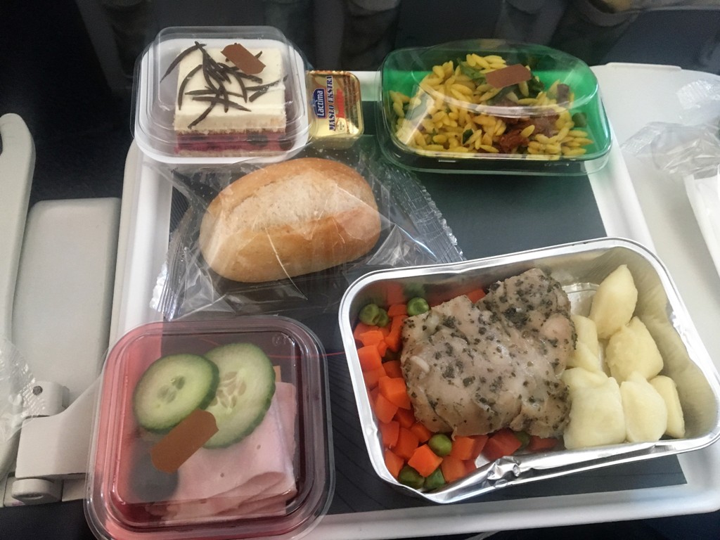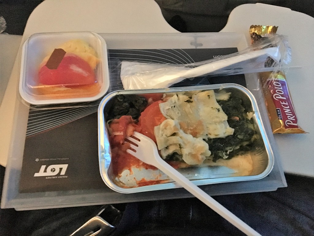 Potwierdzamy też, że jedzenie nie było zbyt smacznie, chociaż obsługa „pierwsza klasa”. Na 12-godzinnej trasie dostaliśmy napoje, ciastko i dwa posiłki: rozgotowanego kurczaka z marchewką i groszkiem, kopytkami i ryżowy makaron, lasagne. Trochę nie chciałam temu wierzyć, bo jak 3 lata temu lecieliśmy do Chicago nie dość, że było bardzo dobre, to jeszcze podane w bardzo ładnych ozdobnych pojemnikach z motywem wzorów ludowych.