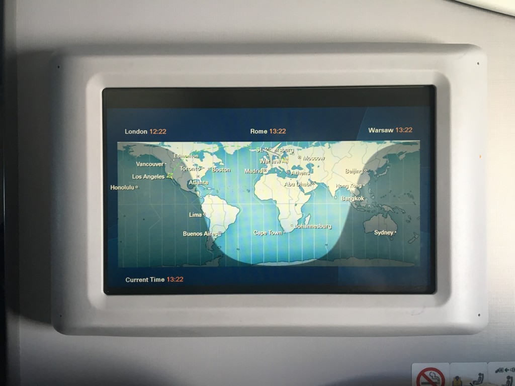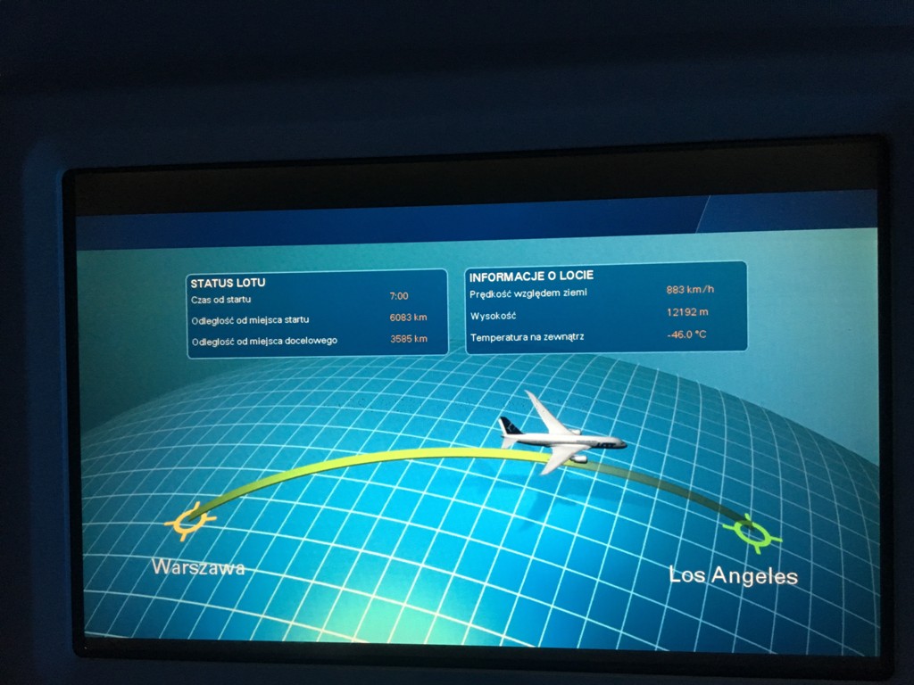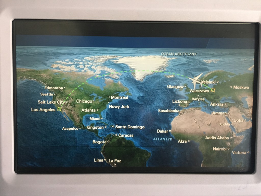 Trasa samolotu do Los Angeles prowadziła nad Szwecją, Norwegią, Islandią, Grenlandią, Kanadą, czyli górą. Ekran pokładowy pokazywał nam gdzie się aktualnie znajdujemy, z jaką prędkością lecimy i ile zostało nam do końca. Możliwość podglądania gdzie aktualnie jesteśmy to jest olbrzymia zaleta samolotów latających na duże trasy.