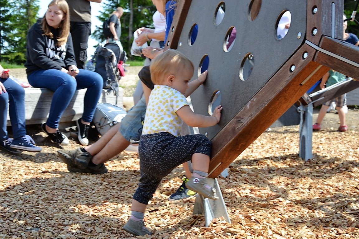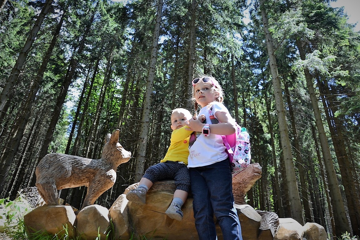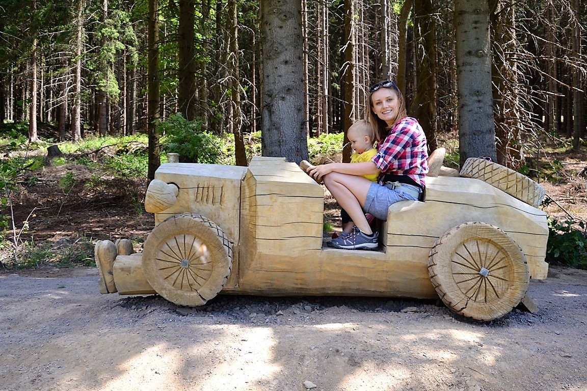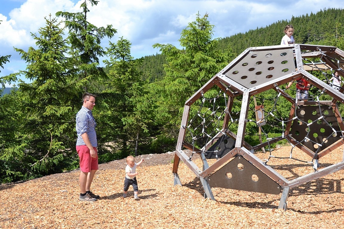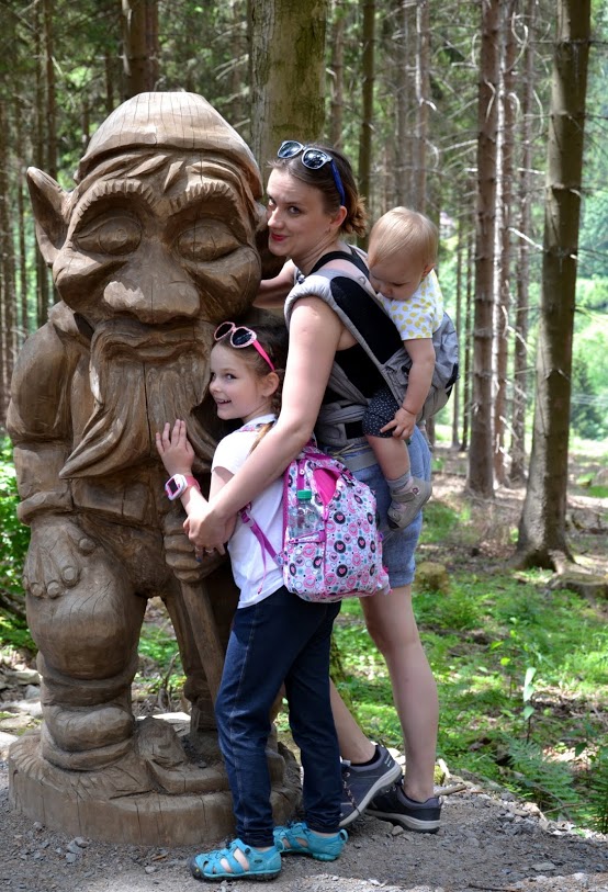 Tym bardziej, że na drodze można spotkać krasnala Stamichmana w różnych leśnych sytuacjach: w namiocie przy ognisku, w domku z kamienia, albo… naprawiającego samochód. Kim jest Stamichman? To nikt inny jak czeski duch gór. Prócz tego, co kilkaset metrów rozstawione są stacje przyrodnicze (niestety tylko po czesku). To świetny pomysł na zmotywowanie małych piechurów! Naszym się podobało! Choć nie wiem, co motywowało bardziej, czy zabawne drewniane rzeźby, czy obietnica zjazdu wielką rurą na szczycie:).